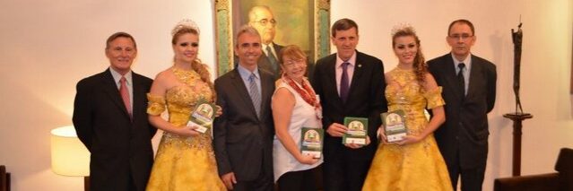 DIVULGAÇÃO – A divulgação da 7ª Expocande segue em ritmo acelerado nos dias que antecedem o evento. Desde o início do mês de abril, a comitiva, liderada pelas soberanas do município, está visitando os municípios da região. O grupo esteve em Agudo, Cachoeira do Sul, Novo Cabrais, Paraíso do Sul, Vera Cruz e Venâncio Aires, além de Sobradinho, na abertura da Festa Estadual do Fiejão (Fejão), ocasião em que entregou o convite oficial ao governador do Estado, Tarso Genro. Além de convidar a região para prestigiar as atrações do evento, a comitiva reforça o convite para a solenidade de abertura, que acontece dia 30 de abril, às 19 horas, no Parque de Eventos Itamar Vezentini.